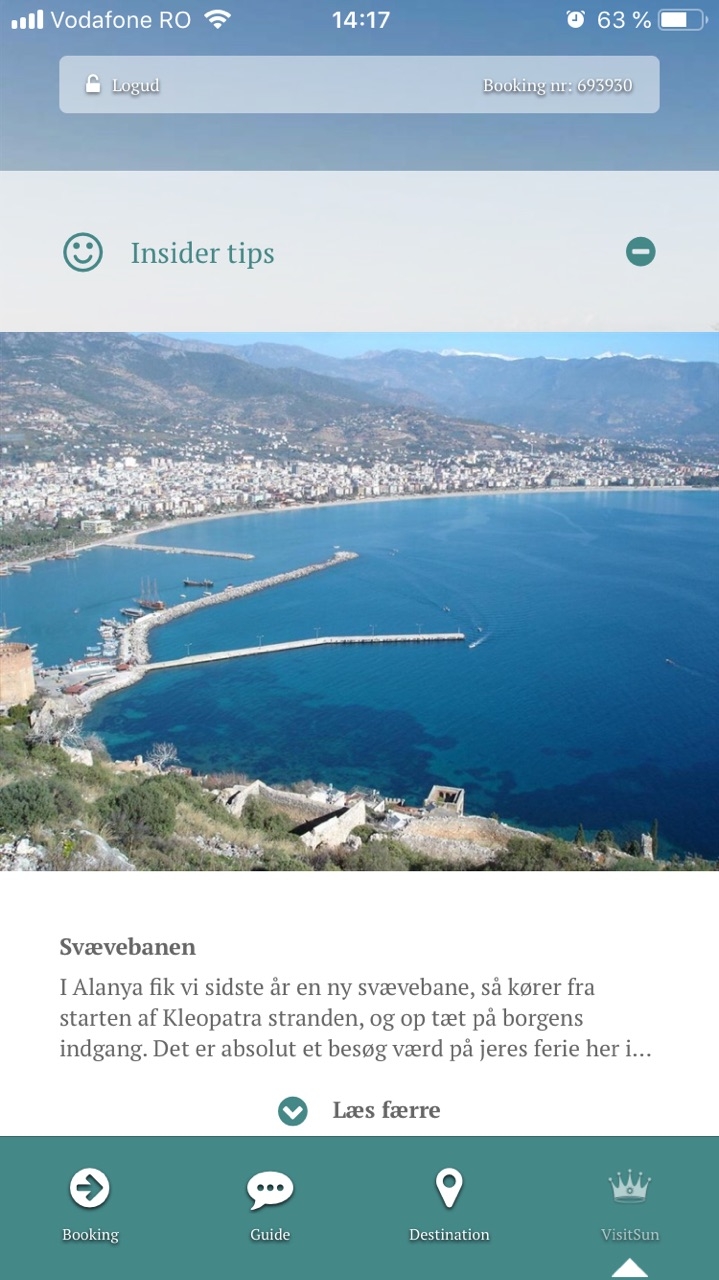 From here, user can access available tabs in the application: Booking, Guide, Destination and VisitSun.
