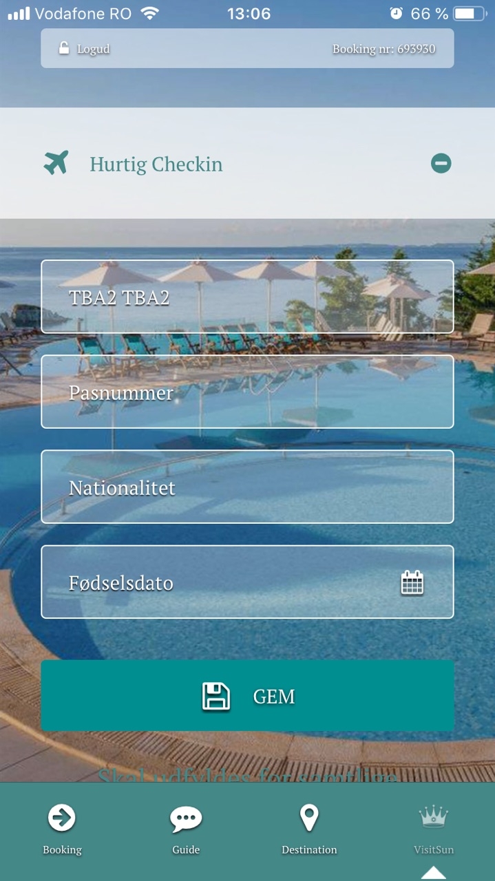 Fast Check in give guests the possibility to do fast check-in at hotel where they are staying from home. Information like first name and last name, passport number, nationality and date of birth should be filled in in order to enable the "Fast Check in".